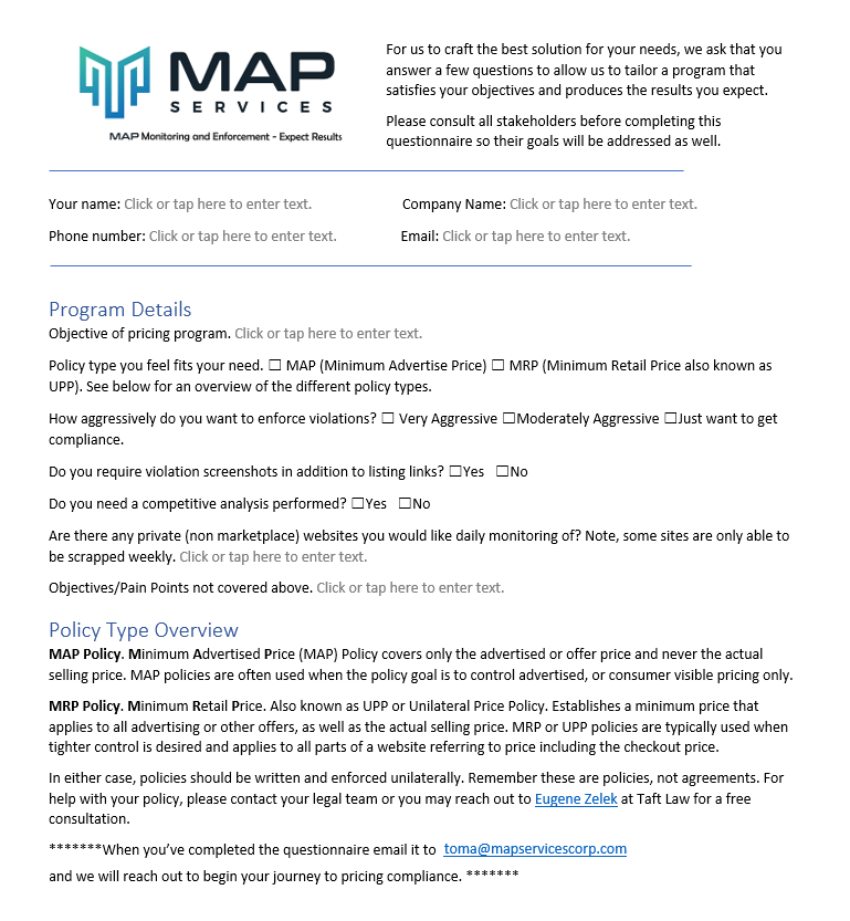 Thank you for considering MAP Services Corp for your price monitoring and enforcement needs. We look forward to working with you and your team.